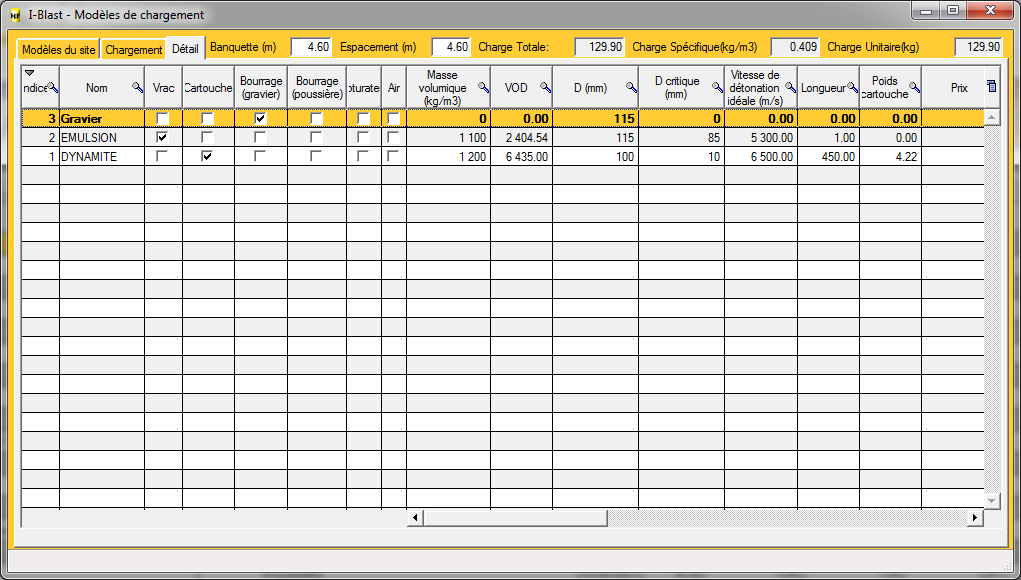 Lors de la sélection d'un modèle de chargement, la table Détail du chargement du trou sélectionné affiche l'ensemble des charges du chargement sélectionné.