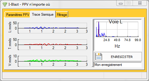 On y trouve la trace des 3 voies sismiques ainsi que la FFT de la voie sélectionnée dans Paramètres PPV